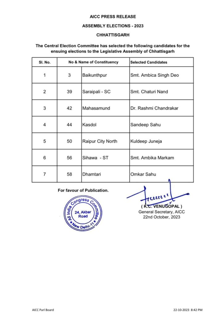 90 विधानसभा सीटों में कांग्रेस प्रत्याशी तय, कांग्रेस ने अपनी अंतिम सूची में 7 सीटों पर प्रत्याशियों को उतारा मैदान में, तो वही 22 मौजूदा विधायकों का कटा टिकट…देखें लिस्ट